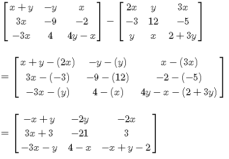 a) \[ - 5 \begin{bmatrix} 5 & - 7 \\ 4 & 6 \end{bmatrix} = \begin{bmatrix} -5(5) & -5(- 7) \\ -5(4) & -5(6) \end{bmatrix}= \begin{bmatrix} -25 & 35 \\ -20 & - 30 \end{bmatrix}\] b) \[ 2 \begin{bmatrix} x & x + y & 6\\ -2 & - x & 1 \end{bmatrix} - 3 \begin{bmatrix} - x & -2y & 0\\ 3x & x & -1 \end{bmatrix} \] Multiply the first matrix by 2 and the second matrix by \( 3 \) \[ = \begin{bmatrix} 2(x) & 2(x + y) & 2(6)\\ 2(-2) & 2(- x) & 2(1) \end{bmatrix} - \begin{bmatrix} 3(-x) & 3(-2y) & 3(0)\\ 3(3x) & 3(x) & 3(-1) \end{bmatrix} = \] Subtract, group and simplify the algebraic expressions \[ = \begin{bmatrix} 5x & 2x+8y & 12\\ -4 - 9x & -5x & 5 \end{bmatrix}\]